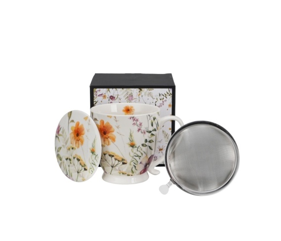 Duży kubek na stopce z serii Pansy, ze stalowym zaparzaczem i pokrywką, wchodzący w skład linii Kwiaty Royal z kolekcji Celebrate Today. Pojemność kubka 480 ml (pojemność liczona po rant kubka). Kolekcja wykonana z porcelany New Bone, zdobiona delikatnym motywem inspirowanym naturą – gałązkami różnych zielonych liści, kwiatami rumianku oraz dominującym po środku żółtym kaczeńcem. Wszystkie elementy zostały namalowane w delikatnych i subtelnych kolorach, co sprawia, że całość emanuje spokojem i harmonią. Można używać w zmywarce oraz kuchence mikrofalowej. Zestaw zapakowany w ozdobny kartonik.