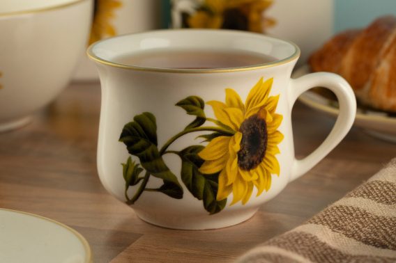 Kubek w kolorze kremowym. Ozdobione motywem słoneczników. Wykonany z użytkowej ceramiki szlachetnej. Wyprodukowany w Polsce przez fabrykę ceramiki szlachetnej w Mieroszowie. Ceramikę można myć w domowych zmywarkach oraz używać w mikrofali.