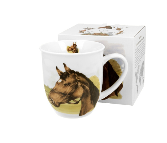 Duży, porcelanowy kubek z serii Świat Zwierząt Portret Konia wchodzący w skład kolekcji Animals. Pojemność całkowita kubka 430 ml (pojemność liczona po rant kubka). Wykonany jest z porcelany New Bone. Kolekcja zdobiona majestatycznym portretem głowy brązowego konia, którego elegancka sylwetka emanuje siłą i gracją.