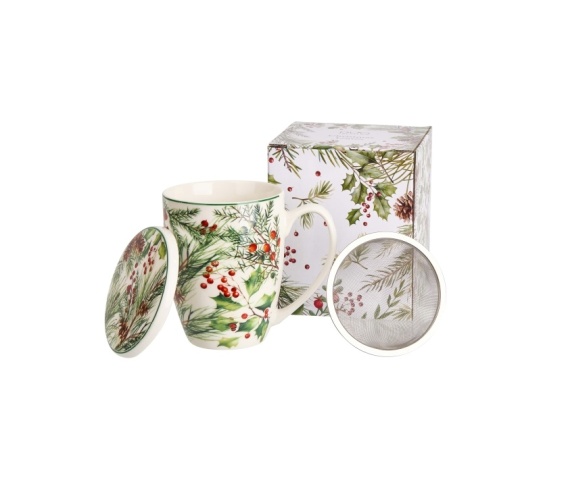 Kubek z pokrywką oraz stalowym zaparzaczem Christmas Leaves wchodzący w skład serii Świątecznej, wykonany z porcelany New Bone. Pojemność kubka 380 ml (pojemność liczona po rant kubka). Doskonały do przyrządzania ulubionej herbaty i aromatycznych ziół. Kolekcja zdobiona motywem intensywnie zielonych gałązek choinek i ostrokrzewu, które przeplatają się ze sobą, tworząc harmonijny, naturalny deseń. Wzór wzbogacony o czerwone jagody, kontrastujące z zielenią, wprowadza w świąteczny nastrój i zimowy klimat. Można używać w zmywarce oraz kuchence mikrofalowej. Zestaw zapakowany w ozdobny kartonik.