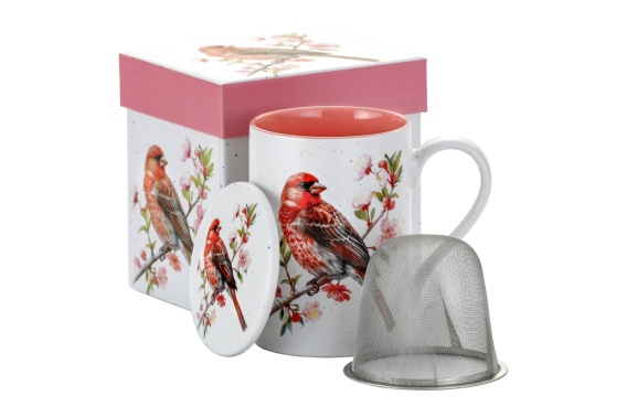 Zestaw kubek ze stalowym zaparzaczem i pokrywką z serii Ptaki firmy Marco Polo. Wykonany z wysokiej jakości ceramiki w matowej wersji. Pojemność kubka 310 ml (pojemność liczona po rant kubka). Cudny kubeczek ozdobiony motywem czerwono czarnego ptaszka siedzącego na ukwieconej gałązce na białym, nakrapianym tle. Kubek po wewnętrznej stronie jest koloru różowego, co dodaje mu uroku. Zestaw można myć w zmywarce. Komplet zapakowany w ozdobny kartonik z pokrywką.