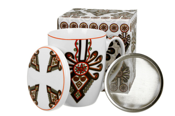 Kubek z zaparzaczem i pokrywką Parzenica wchodzący w skład serii Crocus, wykonany z porcelany New Bone. Pojemność kubka 380 ml (pojemność liczona po rant kubka). Linia zdobiona typowo regionalnym motywem podhala - haftu parzenicy w intensywnym kolorze czarno-czerwonym idealnie komponującym się z białym tłem porcelany. Można używać w zmywarce oraz kuchence mikrofalowej. Kubek zapakowany w ozdobny kartonik.