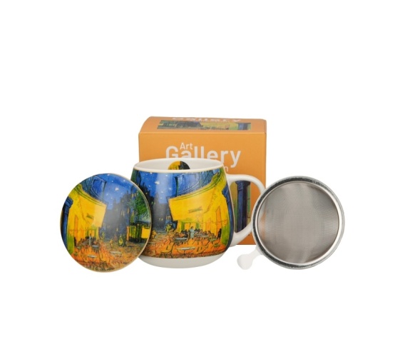 Kubek baryłka "Terrace at Night" by Vincent Van Gogh ze stalowym zaparzaczem i porcelanową pokrywką, wchodzący w skład serii Art Gallery. Pojemność kubka 430 ml (pojemność liczona po rant kubka). Kolekcja wykonana z białej porcelany zdobionej fragmentem reprodukcji obrazu "Taras kawiarni w nocy" Vincenta van Gogh. Idealna kompozycja kolorystyczna charakteryzująca się wyraźnymi kontrastami zdecydowanie zapada w pamięć oraz wyróżnia się na tle pozostałych motywów. Można używać z zmywarce. Zestaw zapakowany w ozdobny kartonik.
