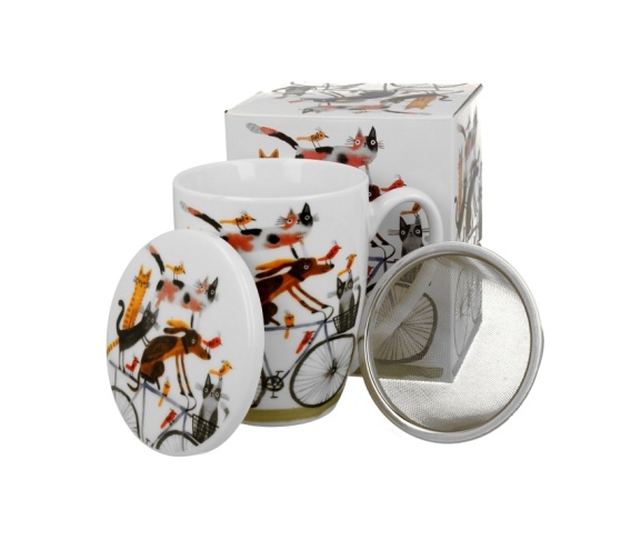 Kubek z pokrywką oraz stalowym zaparzaczem Psi świat - Pies na rowerze wchodzący w skład serii Animals, wykonany z porcelany New Bone. Pojemność kubka 380 ml (pojemność liczona po rant kubka). Doskonały do przyrządzania ulubionej herbaty i aromatycznych ziół. Kolekcja zdobiona wizerunkiem malowanego psa na rowerze w towarzystwie fantazyjnych domowych kotów. Można używać w zmywarce oraz kuchence mikrofalowej. Zestaw zapakowany w ozdobny kartonik.