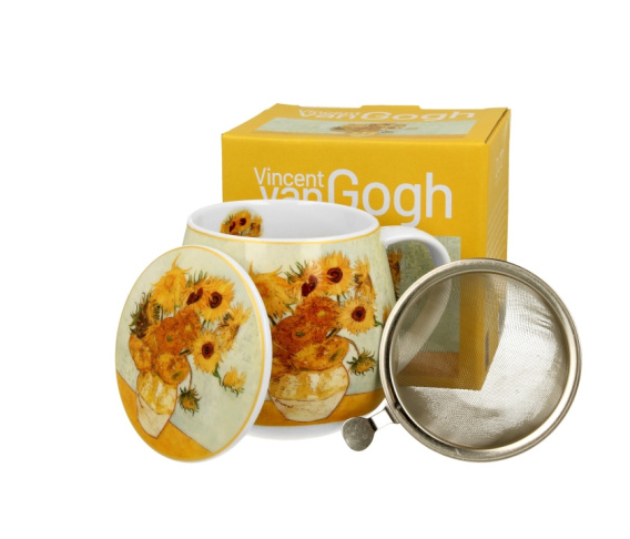 Kubek baryłka Sunflowers by V. Van Gogh z zaparzaczem i pokrywką, wchodzący w skład serii Art Gallery. Pojemność kubka 430 ml (pojemność liczona po rant kubka). Kolekcja wykonana z białej porcelany zdobionej fragmentem reprodukcji obrazu "Słoneczniki" V. van Gogha. Pastelowe ale jednocześnie soczyste kolory idealnie odzwierciedlają charakter obrazu. Można używać z zmywarce. Zestaw zapakowany w ozdobny kartonik.