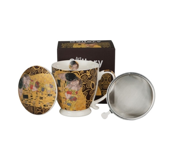 Duży kubek na stopce ze stalowym zaparzaczem i pokrywką "The kiss" brown inspired by Gustav Klimt wchodząca w skład serii Art Gallery. Pojemność kubka 510 ml (pojemność liczona po rant kubka). Kolekcja wykonana z porcelany New Bone, zdobionej reprodukcją obrazu "Pocałunek" Gustava Klimta. Ciepła paleta brązu w odcieniu gorącej czekolady w połączeniu z połyskującym złotem nadaje całości wyjątkowo eleganckiego charakteru oraz zaspakaja gusta nie tylko miłośnikom sztuki malarskiej. Można używać w zmywarce oraz kuchence mikrofalowej. Zestaw zapakowany w ozdobny kartonik.