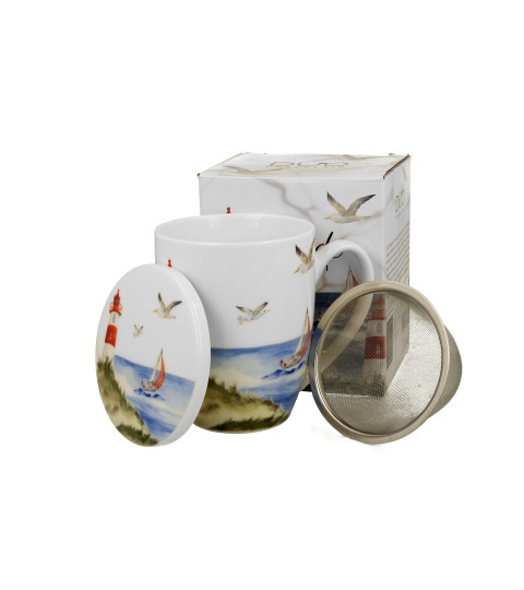 Kubek z pokrywką oraz stalowym zaparzaczem Latarnia Morska wchodzący w skład serii Seaside, wykonany z porcelany New Bone. Pojemność kubka 380 ml (pojemność liczona po rant kubka). Doskonały do przyrządzania ulubionej herbaty i aromatycznych ziół. Kolekcja zdobiona motywem majestatycznej biało-czerwonej latarni morskiej górującej nad falującym, błękitnym morzem. Można używać w zmywarce oraz kuchence mikrofalowej. Zestaw zapakowany w ozdobny kartonik.