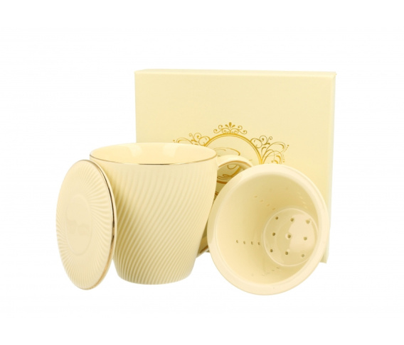 Uroczy kubek z zaparzaczem i pokrywką do ziół, herbaty, kawy ICE CREAM wchodzący w skład serii Ecru Exclusive. Wykonany z porcelany New Bone w kolorze śmietankowym, wykończonej złotymi zdobieniami oraz tłoczeniami na kształt kręconych lodów włoskich. Pojemność kubka 450 ml (pojemność liczona po rant kubka). Zestaw zapakowany w ozdobne pudełko.