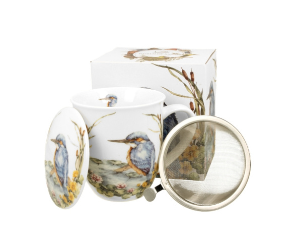 Komplet dużego, porcelanowego kubek wraz z zaparzaczem oraz przykrywką z serii Ptasi świat Zimorodek Zwyczajny wchodzący w skład kolekcji Animals - Ptaki. Pojemność całkowita kubka 430 ml (pojemność liczona po rant kubka). Zestaw wykonany jest z porcelany New Bone, natomiast sitko ze stali nierdzewnej. Kolekcja zdobiona motywem zimorodka na gałązce.
