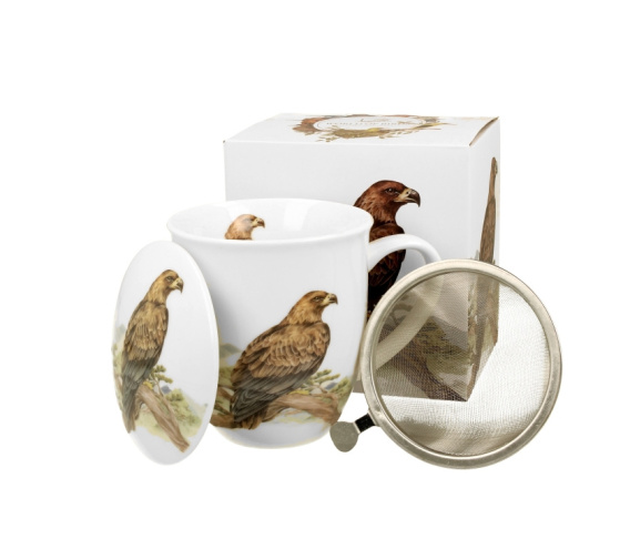 Komplet dużego, porcelanowego kubek wraz z zaparzaczem oraz przykrywką z serii Ptasi świat Orzeł Przedni wchodzący w skład kolekcji Animals - Ptaki. Pojemność całkowita kubka 430 ml (pojemność liczona po rant kubka). Zestaw wykonany jest z porcelany New Bone, natomiast sitko ze stali nierdzewnej. Kolekcja zdobiona motywem jednego z najpopularniejszych znanych i pięknych ptaków jakim jest orzeł.