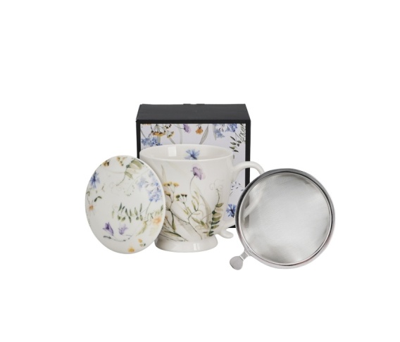 Duży kubek na stopce z serii Melody, ze stalowym zaparzaczem i pokrywką, wchodzący w skład linii Kwiaty Royal z kolekcji Celebrate Today. Pojemność kubka 480 ml (pojemność liczona po rant kubka). Kolekcja wykonana z porcelany New Bone, zdobiona delikatnym motywem inspirowanym naturą – gałązkami różnych zielonych liści, kwiatami rumianku, drobnymi kwiatami polnymi, stokrotkami i chabrami. Wszystkie elementy zostały namalowane w delikatnych i subtelnych kolorach, co sprawia, że całość emanuje spokojem i harmonią. Można używać w zmywarce oraz kuchence mikrofalowej. Zestaw zapakowany w ozdobny kartonik.