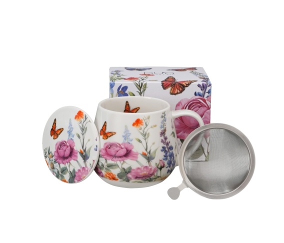 Kubek baryłka z serii Summer, ze stalowym zaparzaczem i pokrywką, wchodzący w skład linii Kwiaty Classic. Pojemność kubka 430 ml (pojemność liczona po rant kubka). Kolekcja wykonana z białej porcelany New Bone, zdobiona kolorowymi kwiatami takimi jak polna róża w intensywnym kolorze fuksji, niebieskie gałązki łubinu. Motyw został ożywiony kolorowymi i delikatnymi motylami. Można używać w zmywarce oraz kuchence mikrofalowej. Zestaw zapakowany w ozdobny kartonik.