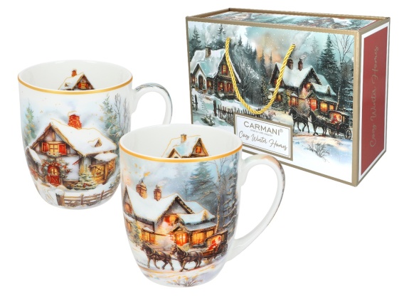 Uroczy zestaw dwóch kubków marki Carmani. Piękne kubki zdobione motywem zimowego, świątecznego krajobrazu "Zimowa idylla". Kubki z porcelany wysokiej jakości o pojemności 440 ml (pojemność liczona po rant kubka). Zestaw można myć w zmywarce i używać w mikrofalówce. Komplet zapakowany w ozdobny kartonik.