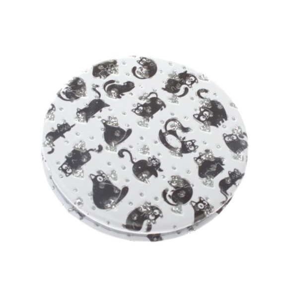 Otwierane lusterko kosmetyczne zdobione motywem czarnych, małych kotków marki Dakls. Podwójne lusterko - jedno naturalne odbicie, drugie idealne do precyzyjnego makijażu (powiększenie x2). Dodatkowego uroku dodają mu malutkie cekinki w kształcie serca. Obudowa lusterka powstała z solidnej, odpornej na zarysowania konstrukcji, a jego poręczny, okrągły kształt sprawia, że zmieści się w każdej torebce – nawet malutkiej listonoszce. Średnica lusterka7 cm. Lusterko zapakowane w celofan.