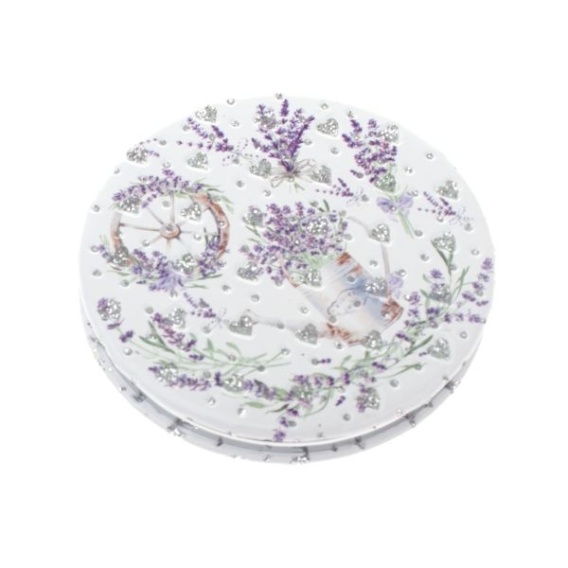 Otwierane lusterko kosmetyczne zdobione motywem lawendy marki Dakls. Podwójne lusterko - jedno naturalne odbicie, drugie idealne do precyzyjnego makijażu (powiększenie x2). Dodatkowego uroku dodają mu malutkie cekinki w kształcie serca. Obudowa lusterka powstała z solidnej, odpornej na zarysowania konstrukcji, a jego poręczny, okrągły kształt sprawia, że zmieści się w każdej torebce – nawet malutkiej listonoszce. Średnica lusterka7 cm. Lusterko zapakowane w celofan.