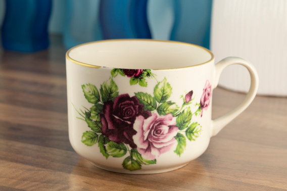 Kubek w kolorze kremowym. Ozdobiony motywem róży. Wykonany z użytkowej ceramiki szlachetnej. Wyprodukowany w Polsce przez fabrykę ceramiki szlachetnej w Mieroszowie. Ceramikę można myć w domowych zmywarkach.