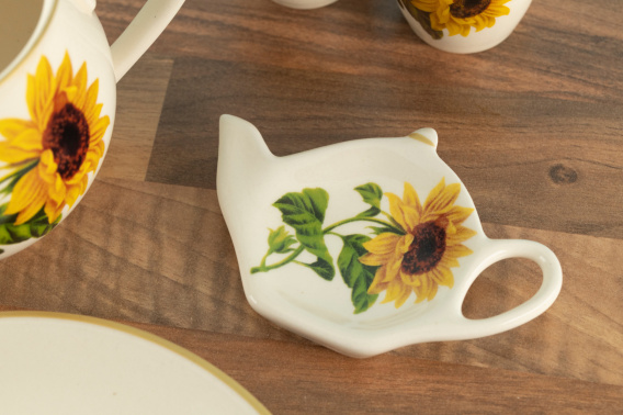 Podstawka w kolorze kremowym. Ozdobiona motywem słoneczników. Wykonany z użytkowej ceramiki szlachetnej. Wyprodukowana w Polsce przez fabrykę ceramiki szlachetnej w Mieroszowie. Ceramikę można myć w domowych zmywarkach.