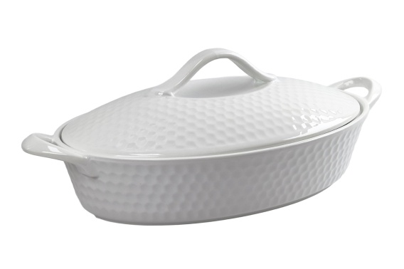 Owalne, białe, ceramiczne naczynie żaroodporne z pokrywką marki Frank Moller. Naczynie wykonane z grubej ceramiki dobrej jakości, ozdobione delikatnym tłoczeniem. Pojemność naczynia wynosi 2,8 l. Posiada dwa uchwyty, które pozwalają w łatwy sposób przenosić go w różne miejsca. Można używać w zmywarce oraz piekarniku. Komplet zapakowany w ozdobny kartonik.