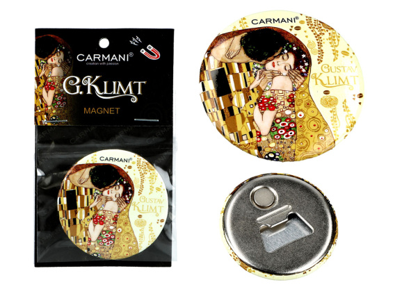 Okrągły otwieracz do butelek z magnesem firmy Carmani. Otwieracz dekorowany motywem z obrazu Gustava Klimta "Pocałunek". Otwieracz wykonany jest z metalu. Średnica 5,6 cm.