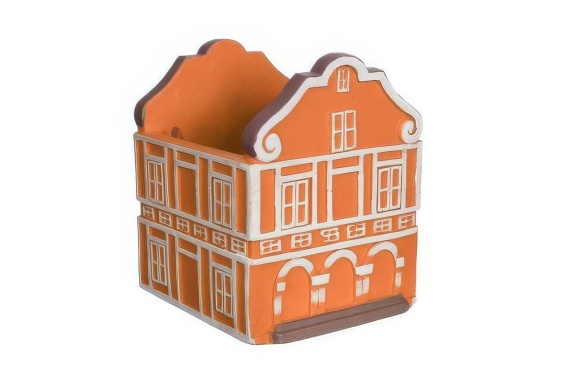 Ceramiczna, kwadratowa osłonka w kształcie domku z serii Viva la Vida marki IDEAS 4 Seasons. Domek koloru pomarańczowego z białymi obrysami okiennic, drzwi, dachu. Wysokość osłonki w najwyższym punkcie 10,5 cm, długość 8 cm, długość wlotu osłonki 5,8 cm. Osłonka posiada od spodu 4 filcowe stopki, dzięki którym nie rysuje ona powierzchni.