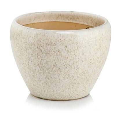 Duża osłonka ceramiczna marki Polnix. Doniczka ma tradycyjny, okrągły, pękaty kształt, w kolorze beżowym o subtelnym nakrapianiu, w błyszczącym wykończeniu. Wysokość donicy 20 cm, średnica 28 cm. Osłonka od spodu posiada 4 filcowe stopki, dzięki którym nie rysuje ona powierzchni. Doniczka nie jest mrozoodporna. Nie posiada otworu drenażowego. Tego typu donice wykonywane są z odpowiedniego rodzaju ceramiki szkliwionej, dzięki czemu donice mogą nieznacznie różnić się od siebie.