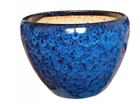 Duża osłonka ceramiczna marki Polnix. Doniczka ma tradycyjny, okrągły, pękaty kształt, zdobiona nieregularnym wzorem stempli w różnych odcieniach niebieskiego, w błyszczącym wykończeniu. Wysokość donicy 19,5 cm, średnica 28 cm. Osłonka od spodu posiada 4 filcowe stopki, dzięki którym nie rysuje ona powierzchni. Doniczka nie jest mrozoodporna. Nie posiada otworu drenażowego. Tego typu donice wykonywane są z odpowiedniego rodzaju ceramiki szkliwionej, dzięki czemu donice mogą nieznacznie różnić się od siebie.