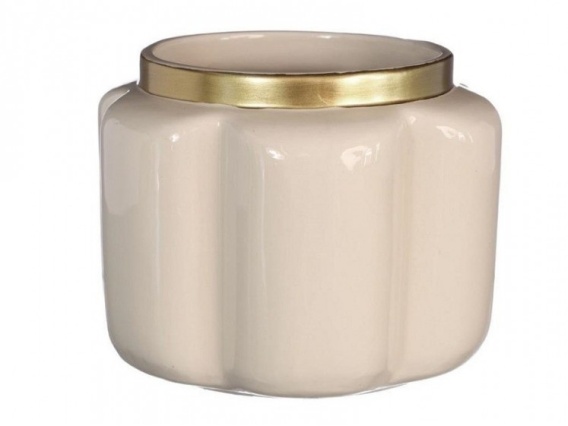 Osłonka ceramiczna kształtem przypominająca kwiat z serii Pouff. Tłoczona doniczka jest koloru kremowego połyskującego ze złotą górną obwódką. Wysokość osłonki 14 cm. Doniczka wykonana jest z ceramiki dobrej jakości. Średnica osłonki 17,6 cm. Doniczka od spodu posiada 3 filcowe stopki, dzięki którym nie rysuje ona powierzchni. Doniczka nie jest mrozoodporna. Nie posiadają otworu drenażowego.