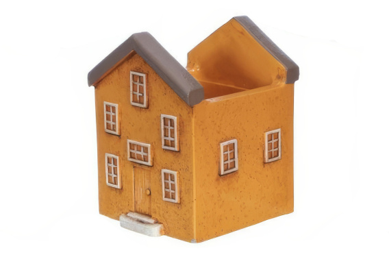 Ceramiczna, kwadratowa osłonka w kształcie domku z serii Curacao marki IDEAS 4 Seasons. Domek koloru pomarańczowego, przecieranego sprawiającego wrażenie wiekowości domku. Wysokość osłonki w najwyższym punkcie 13 cm, długość 10,5 cm, długość wlotu osłonki 8,7 cm. Osłonka posiada od spodu 4 filcowe stopki, dzięki którym nie rysuje ona powierzchni.