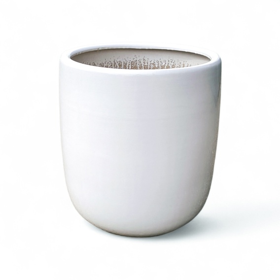 Wielka osłonka ceramiczna z serii Mood marki Polnix. Doniczka ma tradycyjny, okrągły kształt w kolorze białym bez zdobień, w błyszczącym wykończeniu. Wysokość osłonki 44,5 cm, średnica górna 39 cm. Doniczka nie jest mrozoodporna. Nie posiada fabrycznego otworu drenażowego, lecz jest możliwość zrobienia go samemu, poprzez zamontowany fabrycznie na spodzie donicy element z tworzywa sztucznego. Tego typu osłonki wykonywane są ręcznie z odpowiedniego rodzaju ceramiki szkliwionej, dzięki czemu donice mogą nieznacznie różnić się od siebie.