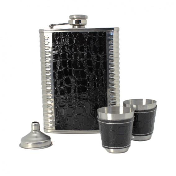 Elegancki zestaw piersiówki z dwoma kieliszkami oraz lejkiem. Komplet wykonany ze stali nierdzewnej (stainless steel 8oz). Pojemność piersiówki 220 ml, natomiast pojemność kieliszka 25 ml. Piersiówka oraz kieliszki ozdobione zostały eko-skórą. Piersiówka wyposażona w szczelny, zakręcany korek. Wysokość piersiówki 14 cm, wysokość kieliszka 4cm. Całość zapakowana w ozdobny, czarny kartonik zamykany na magnez.