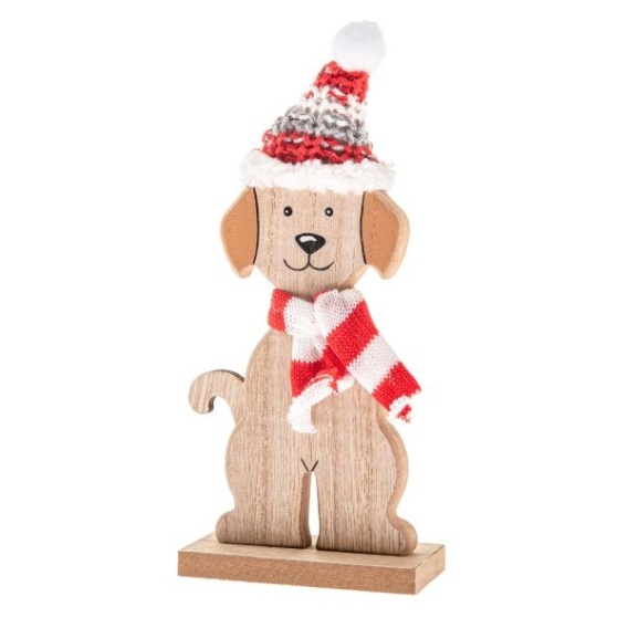 Drewniany piesek jako świąteczny wystrój wnętrza marki Dakls. Pies jest koloru beżowo brązowego. Dodatkowo piesek ubrany jest w czerwono-szaro-białą czapkę z białym pomponem i szalik wykonane z dzianiny. Pies ustawiony jest na drewnianej podkładce, dzięki czemu możemy go postawić w każdym wybranym przez nas miejscu. Całość tworzy uroczą świąteczną dekorację. Wysokość figurki 18 cm.