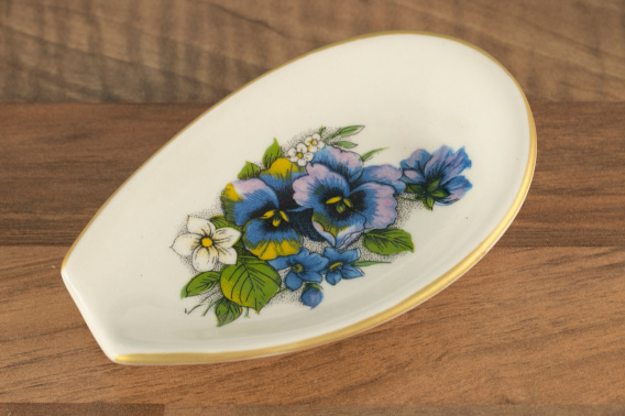 Podstawka pod łyżkę w kolorze kremowym. Ozdobiona motywem bratków. Wykonana z użytkowej ceramiki szlachetnej. Wyprodukowana w Polsce przez fabrykę ceramiki szlachetnej w Mieroszowie. Ceramikę można myć w domowych zmywarkach.