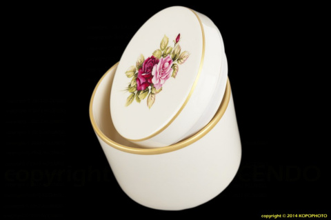 Pojemnik w kolorze kremowym. Ozdobione motywem róży. Wykonany z użytkowej ceramiki szlachetnej. Wyprodukowany w Polsce przez fabrykę ceramiki szlachetnej w Mieroszowie. Ceramikę można myć w domowych zmywarkach oraz używać w mikrofali.