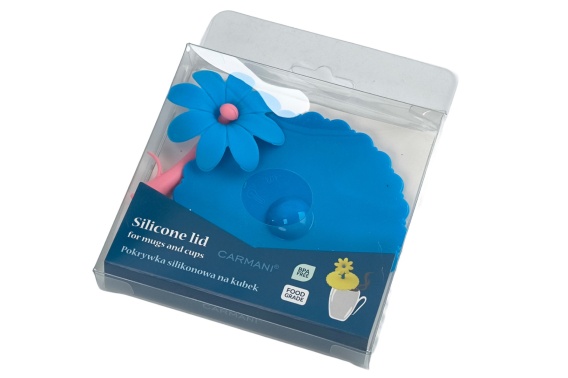 Pokrywka silikonowa do kubka marki Carmani. Przykrywka w kolorze niebieskim z ozdobnym uchwytem w kształcie niebieskiego kwiatka na różowej nóżce. Pokrywka chroni Twój napój przed zbyt szybką utratą ciepła, przed niechcianymi owadami, dłużej zachowując jego świeżość. Przykrywka dostosowana do kontaktu z żywnością, wolna od BPA. Odporna na temperatury do 220 stopni. Można używać w zmywarce oraz w kuchence mikrofalowej. Średnica pokrywki 10 cm. Zapakowana w przeźroczysty kartonik.