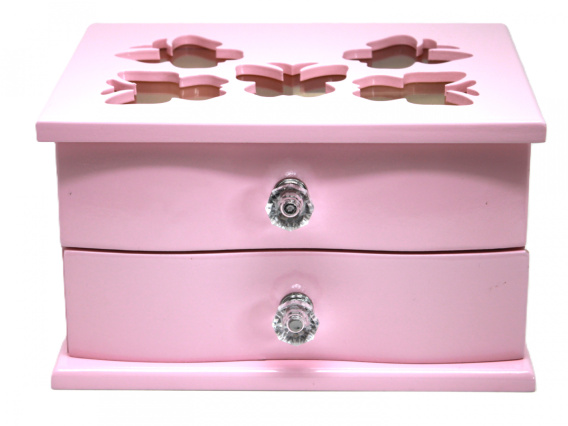 Drewniany pojemnik na biżuterię w kolorze różowym z ozdobnymi motylkami na pokrywie otwieranej na zawias. Organizer z trzema przegródkami i jedną szufladką. W środku szkatułka posiada żółte, miękkie wykończenie. Wymiary szkatułki 20 cm x 15 cm x h12 cm.
