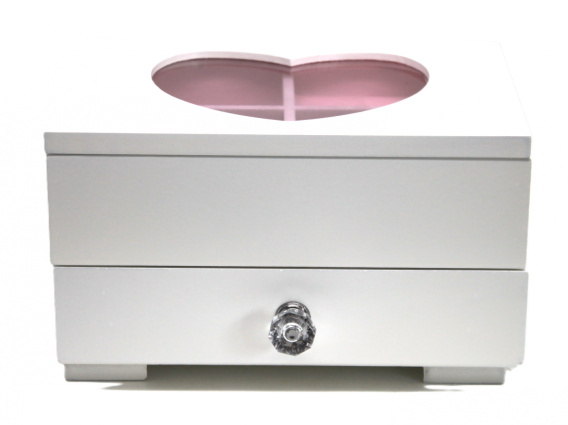 Drewniany pojemnik na biżuterię w kolorze białym z ozdobnym serduszkiem na pokrywie otwieranej na zawias. Organizer z czterema przegródkami i jedną szufladką. W środku szkatułka posiada różowe, miękkie wykończenie. Wymiary szkatułki 19 cm x 14 cm x h11,5 cm.