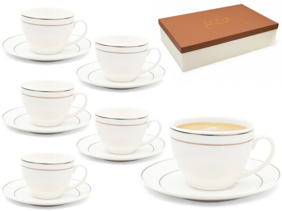 Uroczy komplet z serii Bella Fiore marki Tragar. Zestaw składa się z sześciu filiżanek oraz sześciu spodków. Pojemność całkowita filiżanki 230 ml. Białe filiżanki zdobione dwoma złotymi paskami przy górnym rancie filiżanki oraz przy rancie spodka zostały wykonane z dobrej jakości porcelany. Zestaw zapakowany w ozdobne pudełko, świetnie nadaje się na prezent.