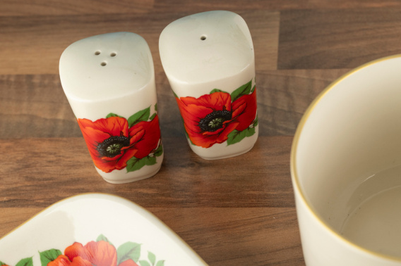 Solniczka i pieprzniczka w kolorze kremowym. Ozdobione motywem maków. Wykonany z użytkowej ceramiki szlachetnej. Wyprodukowany w Polsce przez fabrykę ceramiki szlachetnej w Mieroszowie. Ceramikę można myć w domowych zmywarkach oraz używać w mikrofali.