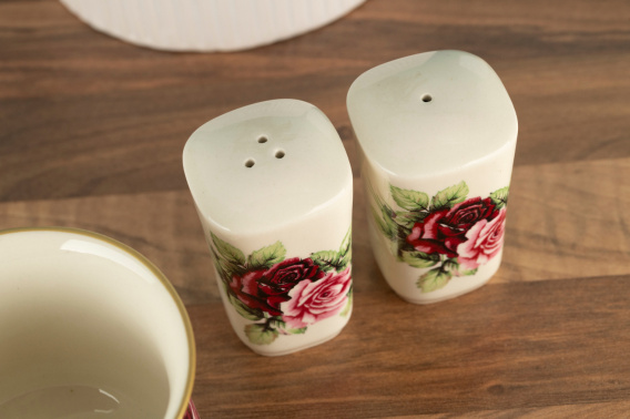 Solniczka i pieprzniczka w kolorze kremowym. Ozdobione motywem róży. Wykonany z użytkowej ceramiki szlachetnej. Wyprodukowany w Polsce przez fabrykę ceramiki szlachetnej w Mieroszowie. Ceramikę można myć w domowych zmywarkach oraz używać w mikrofali.
