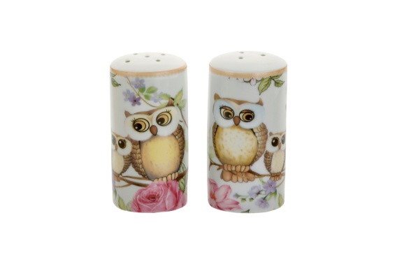 Solniczka i pieprzniczka z serii Sowy marki Marco Polo. Zestaw wykonany z porcelany. Komplet zdobiony rodziną sówek siedzących na gałęzi drzewa pośród kolorowych kwiatów na białym tle.