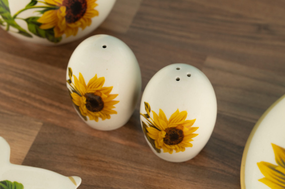 Solniczka i pieprzniczka w kolorze kremowym. Ozdobione motywem słonecznika. Wykonany z użytkowej ceramiki szlachetnej. Wyprodukowany w Polsce przez fabrykę ceramiki szlachetnej w Mieroszowie. Ceramikę można myć w domowych zmywarkach.