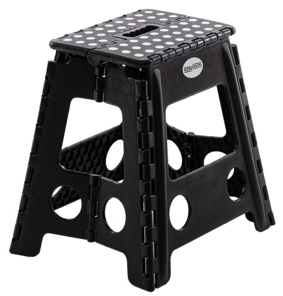 Stabilny, składany taboret marki EasyForm. Lekki, w kolorze czarnym, wykonany z wytrzymałego tworzywa sztucznego. Górna część taboretu posiada antypoślizgowe, białe kropki zwiększające bezpieczeństwo i komfort użytkowania. Wysokość stołka 40 cm, udźwig do 150 kg. Dzięki składanej konstrukcji i specjalnej rączce taboret jest łatwy do przechowywania i przenoszenia.