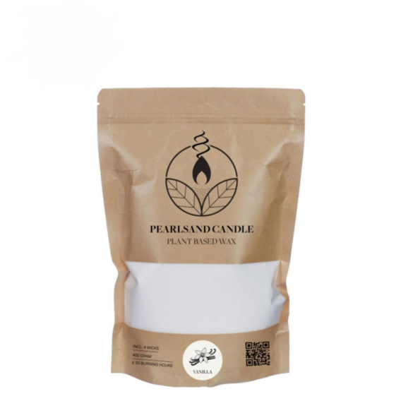 Świeca perłowa w granulacie, stearyna biała o zapachu waniliowym (vanilla). Roślinny wosk w formie kuleczek. Jest to naturalny wosk pochodzenia roślinnego, zapakowany w opakowanie o gramaturze 400 gramów, które zawiera również 4 bawełniane knotki do samodzielnego tworzenia świec.