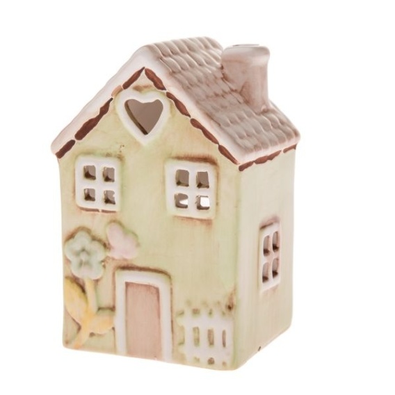Ozdobny, ceramiczny świecznik w kształcie domku koloru pistacjowego błyszczącego z beżowym dachem marki Dakls. Wysokość świecznika 11 cm. W świeczniku znajduje się otwór na świeczkę typu tealight. Świecznik ozdobiony otworami w oknach oraz w kominie domku.