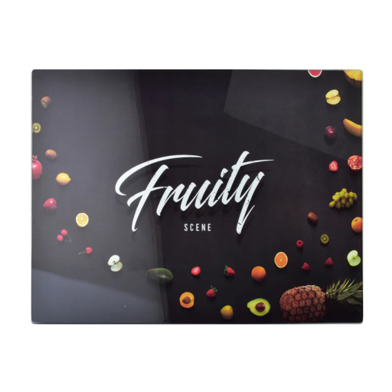 Szklana deska do krojenia z serii Aria marki Allesken. Deska wykonana jest z wysokiej jakości szkła, ozdobiona różnego rodzaju owocami oraz napisem: Fruity scene na czarnym tle. Deska ma kształt prostokąta o wymiarach 20 cm x 30 cm. Szklana deska posiada od spodu cztery antypoślizgowe stopki, które zapewniają stabilność podczas krojenia.