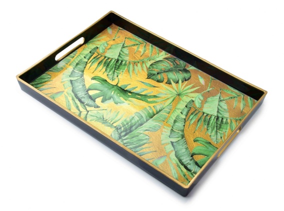 Taca prostokątna z serii BLANCHE COLORS marki Mondex. Wykonana z tworzywa sztucznego z mocnym połyskiem. Taca prezentuje się bardzo elegancko. Jest bardzo trwała i stabilna. Produkt w kolorze czarnym ze złotą obwódką, oraz nadrukiem dużych zielonych liści. Oryginalny wzór pasuje do każdego rodzaju wnętrza czy tarasu. Nie jest przeznaczona do kontaktu z żywnością, zaleca się mycie ręcznie.
