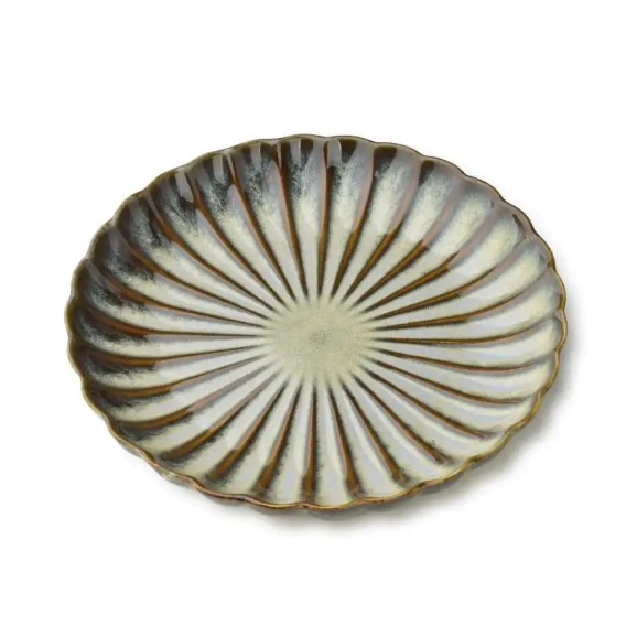 Uroczy, ryflowany talerz deserowy z delikatnym rantem z serii Evie Green marki Affek Design by Mondex. Średnica talerza 20,8 cm. Talerz został wykonany z porcelany, posiada ozdobne, pionowe tłoczenia. Piękny zielono-brązowy kolor talerza z ozdobnymi przetarciami prezentuje się zjawiskowo. Można używać w zmywarce oraz kuchence mikrofalowej.