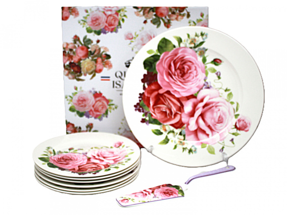 Wyjątkowy 8 elementowy zestaw do ciasta zdobiony motywem pięknych róż na białym tle. Komplet z serii The England Collection z kolekcji Queen Isabell. Zestaw wykonany z wysokiej jakości białej porcelany Fine Bone. W skład zestawu wchodzi: łopatka do ciasta, 6 talerzyków deserowych i jeden duży talerz na ciasto. Komplet można myć w zmywarce. Zapakowany w ozdobny kartonik.