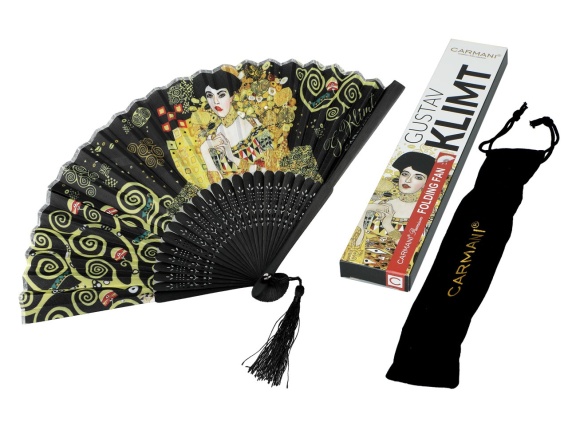 Elegancki wachlarz ozdobiony motywem z obrazu Gustava Klimta "Adel" marki Carmani. Wachlarz jest bardzo lekki, rozkładany półkoliście, dobrze trzyma się go w dłoni. Wysokość wachlarza 21 cm. Zapakowany w ozdobny kartonik.