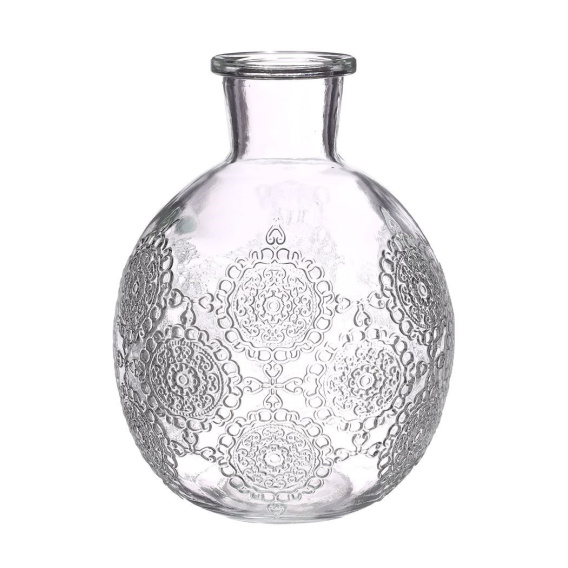 Ozdobna, przeźroczysta, szklana butelka w formie wazonu z serii Bologna Clear marki IDEAS 4 Seasons. Butelka o wysokości 17,5 cm i pojemności 1150 ml, to idealny dodatek do Twojego wnętrza. Butelka w kształcie kuli, posiada ozdobne tłoczenia.